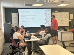 Educators from across the Boston area come together to learn, discuss, and share ideas about authentic writing instruction that centers student voice and agency. More than just learning about it in theory, they also get to see it happening in real time, in the classrooms next door. Our participants observed lessons on writing hooks and on choosing topics for news research, chatted with students about what they were working on, and spent time in our own classroom space connecting what they observed to our framework and their own practice.
